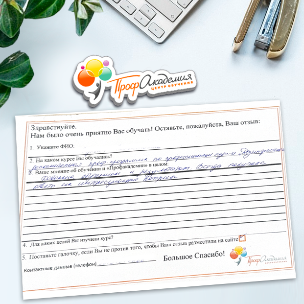 Очень приятно обучаться в "Профакадемии", все очень точно, быстро, внятно. Получила свое удостоверение, спасибо большое.