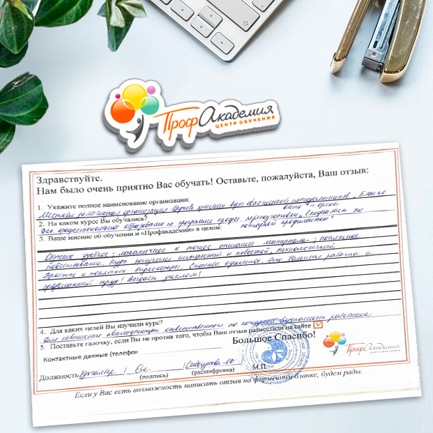 Спасибо Профакадемии за доступное обучение, наши сотрудники с легкостью прошли все курсы, информация в виде презентаций изложена очень четко, лаконично и быстро усваиваться. Мы уже стали Вашими постоянными учениками, будем и дальше взаимодействовать. С вами приятно работать